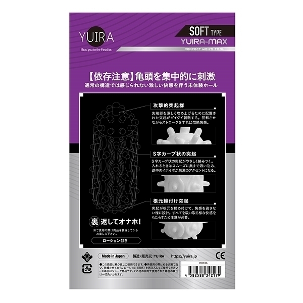 裏返してオナホ!あの人気商品とYUIRAのコラボ実現!簡易オナホがソフトバージョンで新登場!ハードと違い、やわらか素材でアナタを優しく包み込みます♪<選べる3タイプ><安心の日本製><ローション付き>依存注意、亀頭を集中的に刺激、通常の構造では感じられない激しい快感を伴う未体験ホール、攻撃的突起群、先端部をグイグイ刺激する突起配置。回転させながらのストロークで悶絶快感。S字カーブ状の突起、途中のイボイボが刺激のアクセントに。S字カーブ突起がやさしく絡みつき奥まで挿入をスムーズにサポート。根本締付け突起−突起が根元を締付け快感を逃さない安定設計。全吸収する様な快感を伴うため注意が必要。※ご使用の際は本商品を裏返してからお楽しみください。