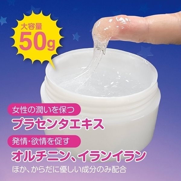女性のために開発された潤いサポートジェルです♪馬プラセンタエキスやマカエキスなど、美容とスタミナを意識した成分を配合しています!オルニチンやガラナ種子エキスなどの植物由来成分で、やさしくしっかりとサポート♪血行促進を助ける黒ショウガエキスも加え、使用感にもこだわりました!女性ホルモンに似た働きをもつとされるダイズ種子エキスも含まれており、安心して使える処方です♪合成ポリマーなど刺激となりやすい成分は不使用なので、デリケートな部分にもやさしく使えます!香りにはイランイランを配合し、心地よいリラックスタイムを演出します♪一人でのケアやパートナーとの時間にも活躍するアイテムです!50gの大容量だから、たっぷり使えてコスパも抜群です♪毎日のケアに取り入れやすいジェルタイプで扱いやすさも◎♪やさしくなじませて、自分らしいコンディションをサポートしましょう!
