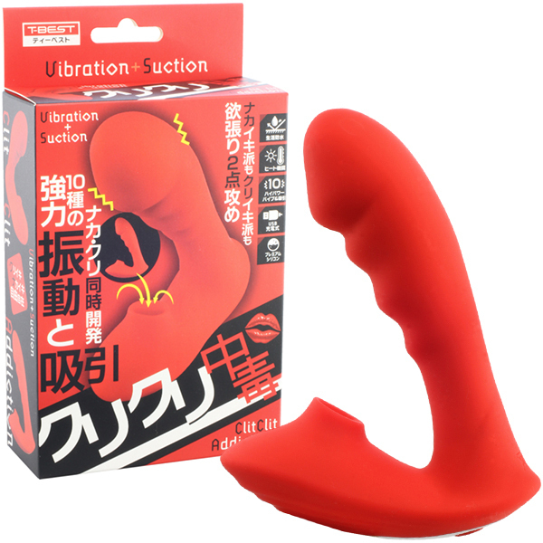 これさえあれば中イキ派もクリ派も大満足の欲張り2点攻めバイブ「クリクリ中毒」。リアル形状の先端が挿入感をしっかり感じさせながら波打つ挿入部が腟内をしっかり振動してくれます♪クリ吸引も強力でハイパワー!クリトリスを攻め立てながらGスポットも刺激する2点攻めで快感も最高潮♪10種類の強力振動と吸引機能でナカも外も同時に開発しながらイカせてくれます。ぬくもりを感じるヒート機能を搭載しているので寒い日でも冷たくなく、人肌の暖かさで挿入感がよりリアルに感じられます♪高級シリコンを使用しているので肌触りも最高。生活防水仕様なのでご使用後はしっかり水洗いが出来ます♪電源はUSB充電式でフル充電120分で連続稼働120分です。